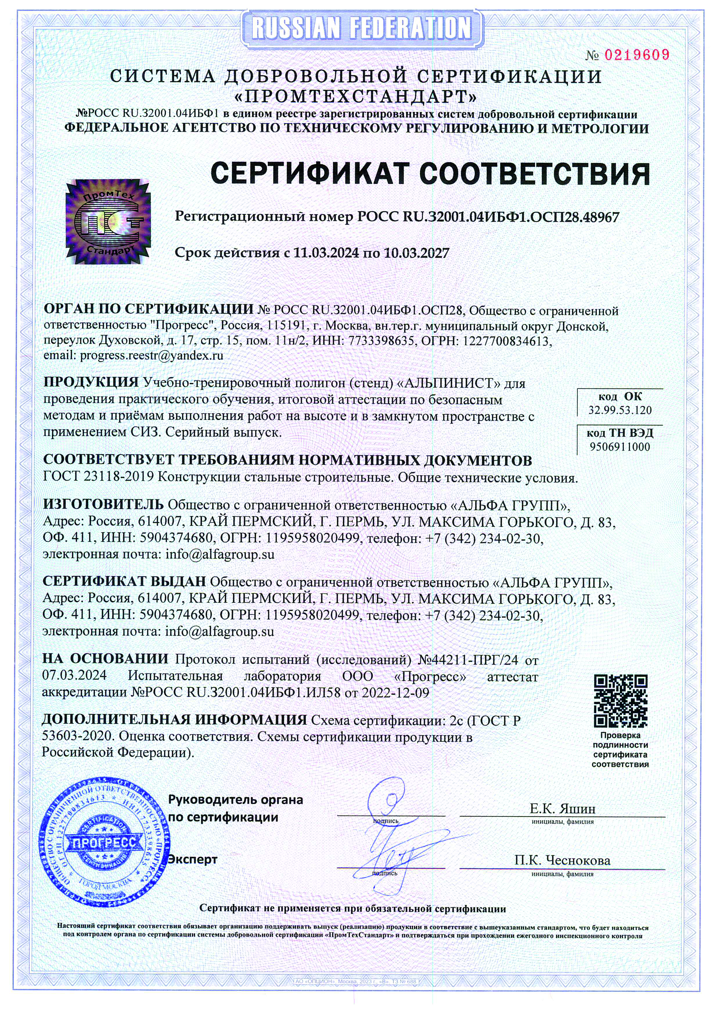 • Учебные комплексы «АЛЬПИНИСТ» сертифицированы и изготавливаются по Техническим условиям ООО «АЛЬФА ГРУПП» Полигон учебно-тренировочный ТУ 32.99.53-001-40191441-2019;